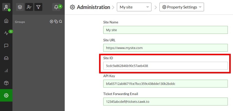 You can find the Site ID in the tawk.to dashboard under Administration > Your Site > Property Settings.