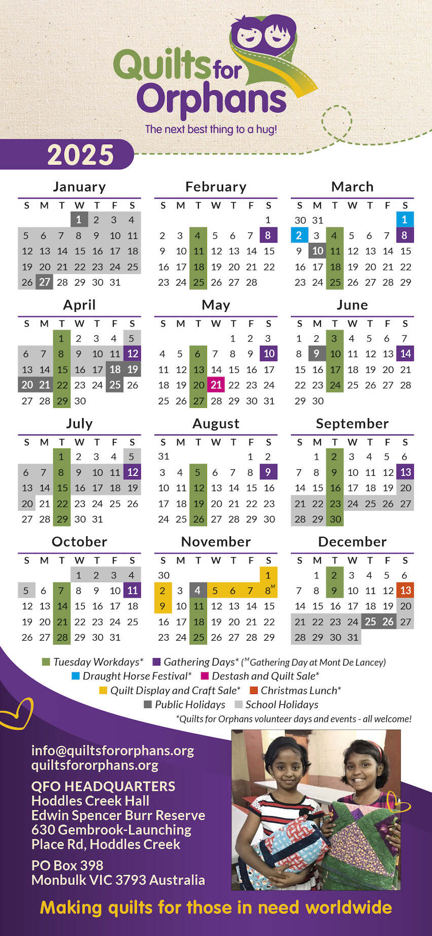 We are at the Hoddles Creek Hall on Tuesdays, (except for Cup Day), and the second Saturday of the month from February to October, from 9.30 am to 3 pm.