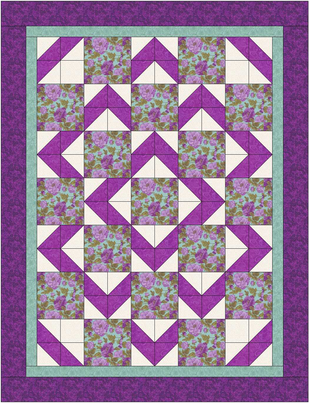 A great way of using a large print fabric for the squares in the centre. Pattern includes two quick ways of making Half-Square Triangles - one of them makes EIGHT at a time!Christine has made a lovely quilt using aqua toned batiks!