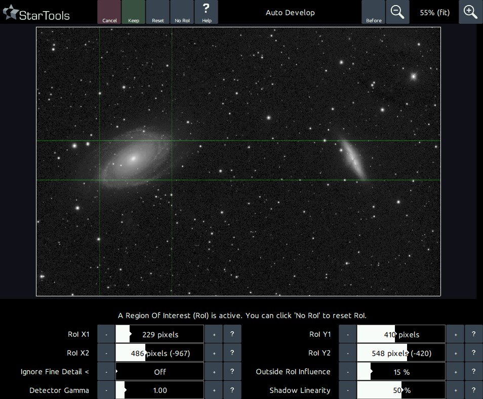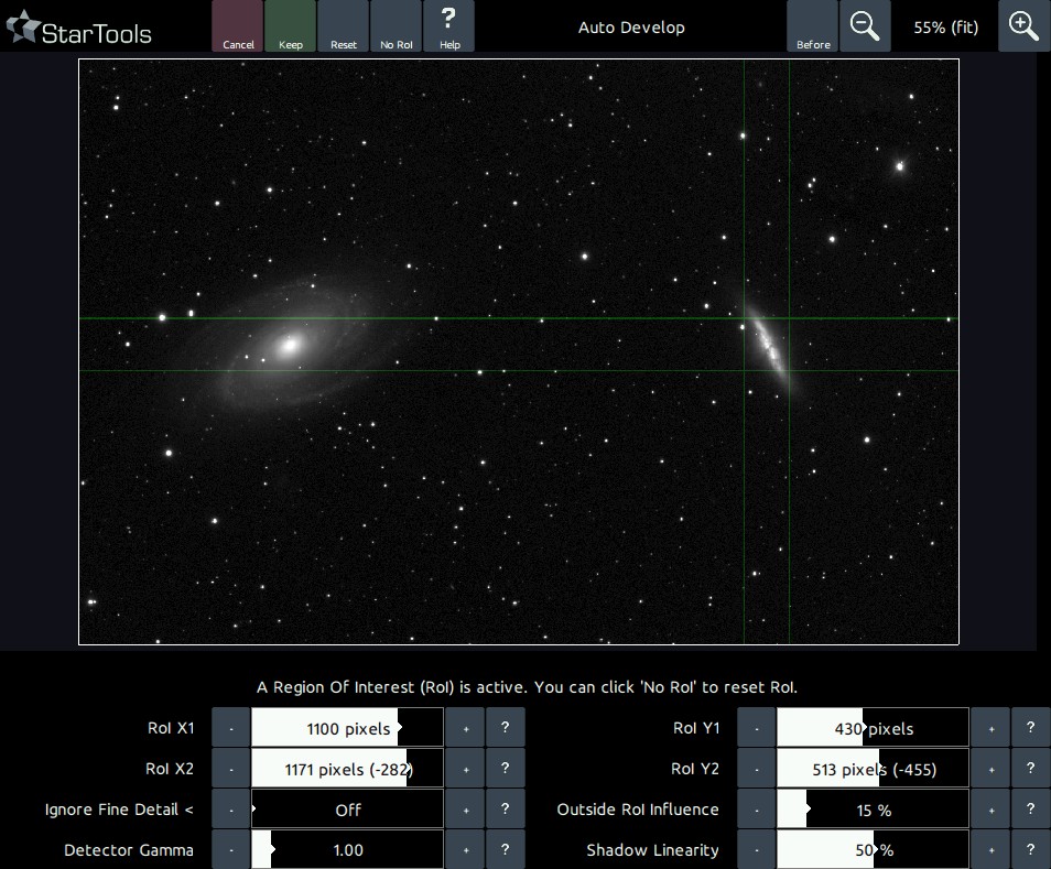 All the RoI needs, is the best possible example of the dynamic range problem it should be solving for. Therefore, you should always give an example that has the widest dynamic range (e.g. has features that run from most dark to most bright). For example, when using AutoDev for the M81 / M82 galaxy pair, it is recommended you choose M81 (a brighter magnitude 6.9) as your RoI and not M82 (with a dimmer magnitude of 8.4).
