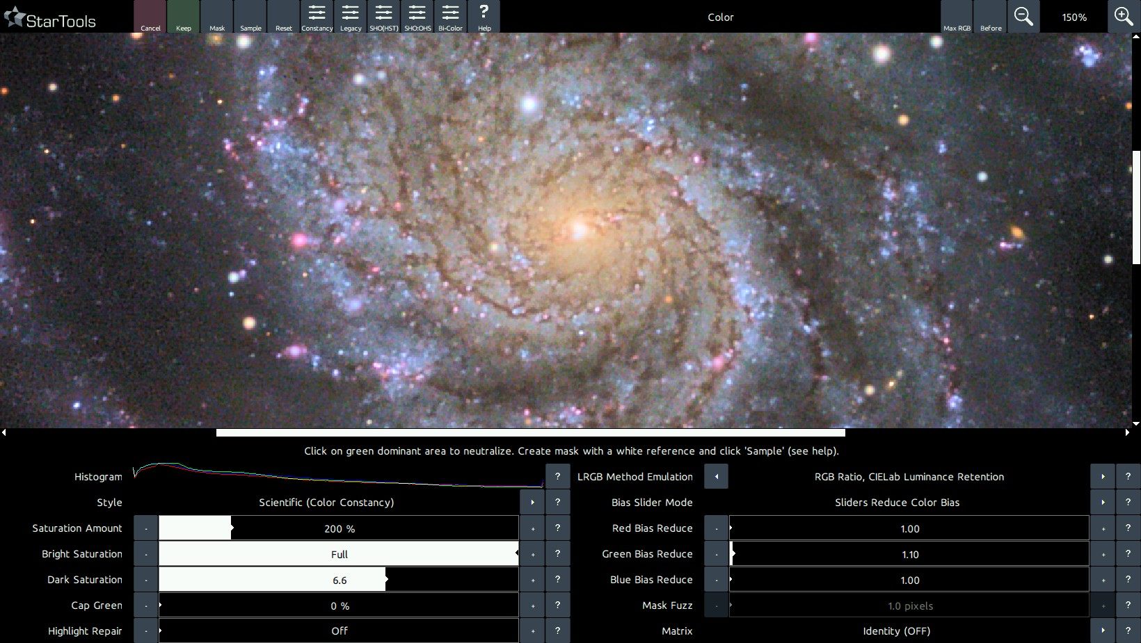 StarTools' Color Constancy feature makes it much easier to see colours and spot processes, interactions, emissions and chemical composition in objects. In fact, the Color Constancy feature makes colouring comparable between different exposure lengths and different gear. This allows for the user to start spotting colours repeating in different features of comparable objects. Such features are, for example, the yellow cores of galaxies (due to the relative over representation of older stars as a result of gas depletion), the bluer outer rims of galaxies (due to the relative over representation of bright blue young stars as a result of the abundance of gas) and the pink/purplish HII area 'blobs' in their discs. Red/brown (white light filtered by dust) dust lanes complement a typical galaxy's rendering.