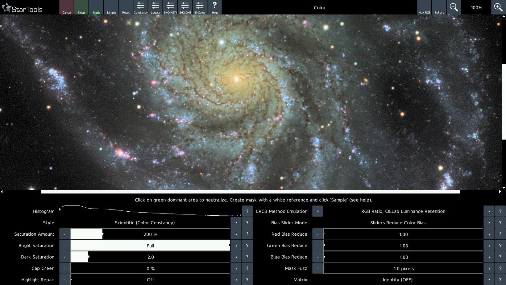 In addition to blinking the mask, the Color module also analyses the image and sets the 'Red, Green and Blue Increase/Reduce' parameters to a value which it deems the most appropriate for your image. This behaviour is identical to manually clicking the 'Sample' button where the whole image is sampled.