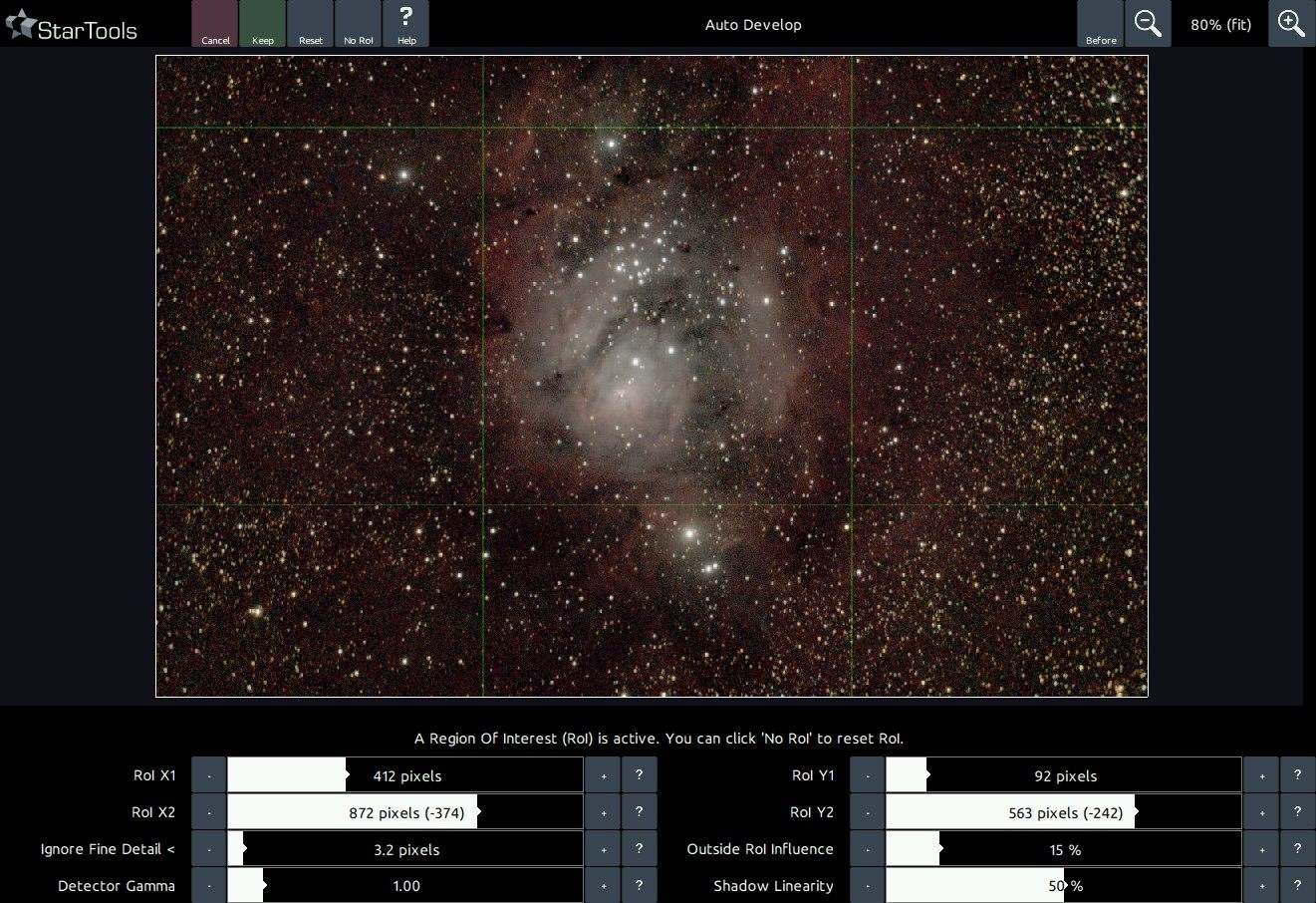 If your object(s) reside on an otherwise uninteresting or "empty" background, you can tell AutoDev where the interesting bits of your image are by clicking & dragging a Region Of Interest ("RoI"). There is no shame in trying multiple RoIs. AutoDev will keep solving for a global strecth that best shows the detail in your RoI.