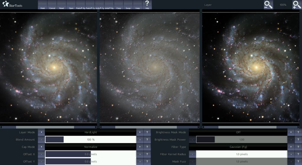 Features like selective layering, automated luminance masking, a vast array of filters (including Gaussian, Median, Mean of Median, Offset, Fractional Differentation and many, many more) allow you to emulate complex algorithms such as SMI (Screen Mask Invert), PIP (Power of Inverse Pixels), star rounding, halo reduction, chromatic aberration removal, HDR integration, local histogram optimization or equalization, many types of noise reduction algorithms and much, much more.