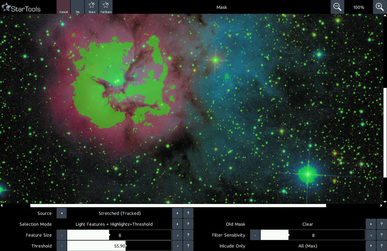 - Include only; tells the selection algorithms evaluate specific colour channels only when looking for features. This is particularly useful if you have a predominantly red, purple and blue nebula with white stars in the foreground and, say, you'd want to select only the stars. By setting 'Include only' to 'Green', you are able to tell the selection algorithms to leave red and blue features in the nebula alone (since these features are most prominent in the red and blue channels). This greatly reduces the amount of false positives.