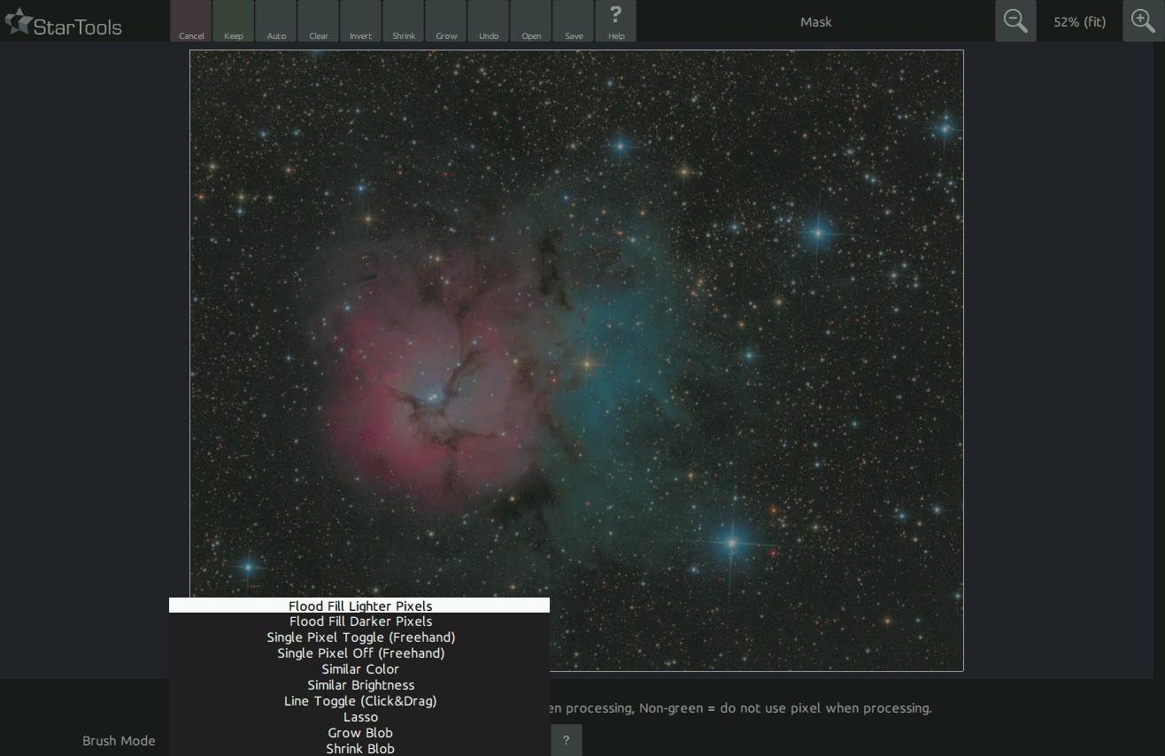 For example, while in 'Flood fill lighter pixels' mode, try clicking next to a bright star or feature to select it. Click anywhere on a clump of 'on' (green) pixels, to toggle the whole clump off again.