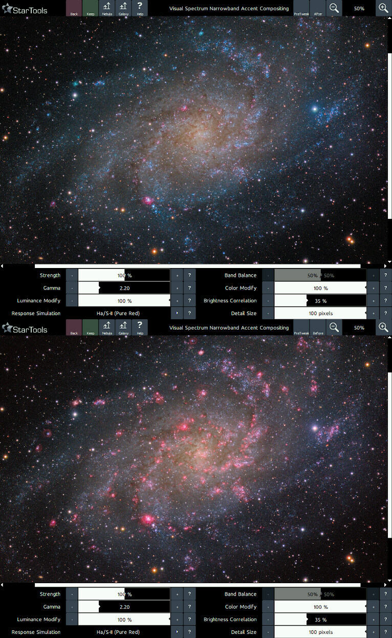 - Ha/S-II (Pure Red) + Hb/O-III (Cyan); uses pure deep red accents for data from the red channel, while using cyan accents for data from the blue and green channels. This mode is particularly useful for narrowband data acquired through the popular duo/tri/quadband filters.