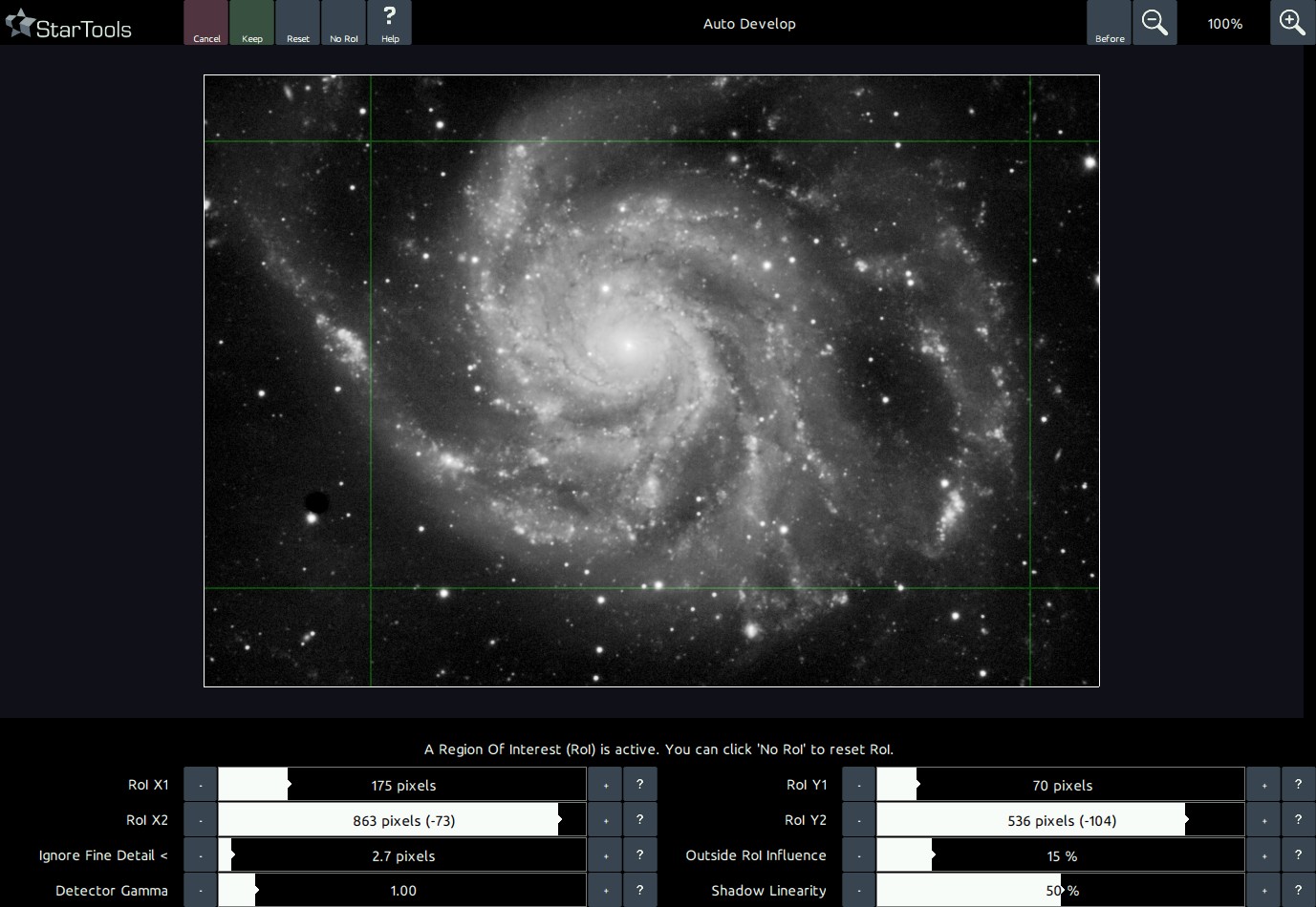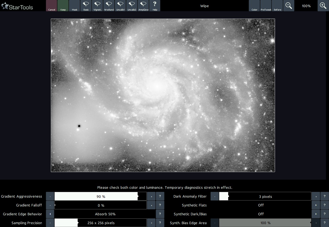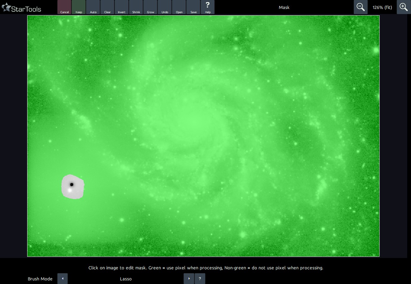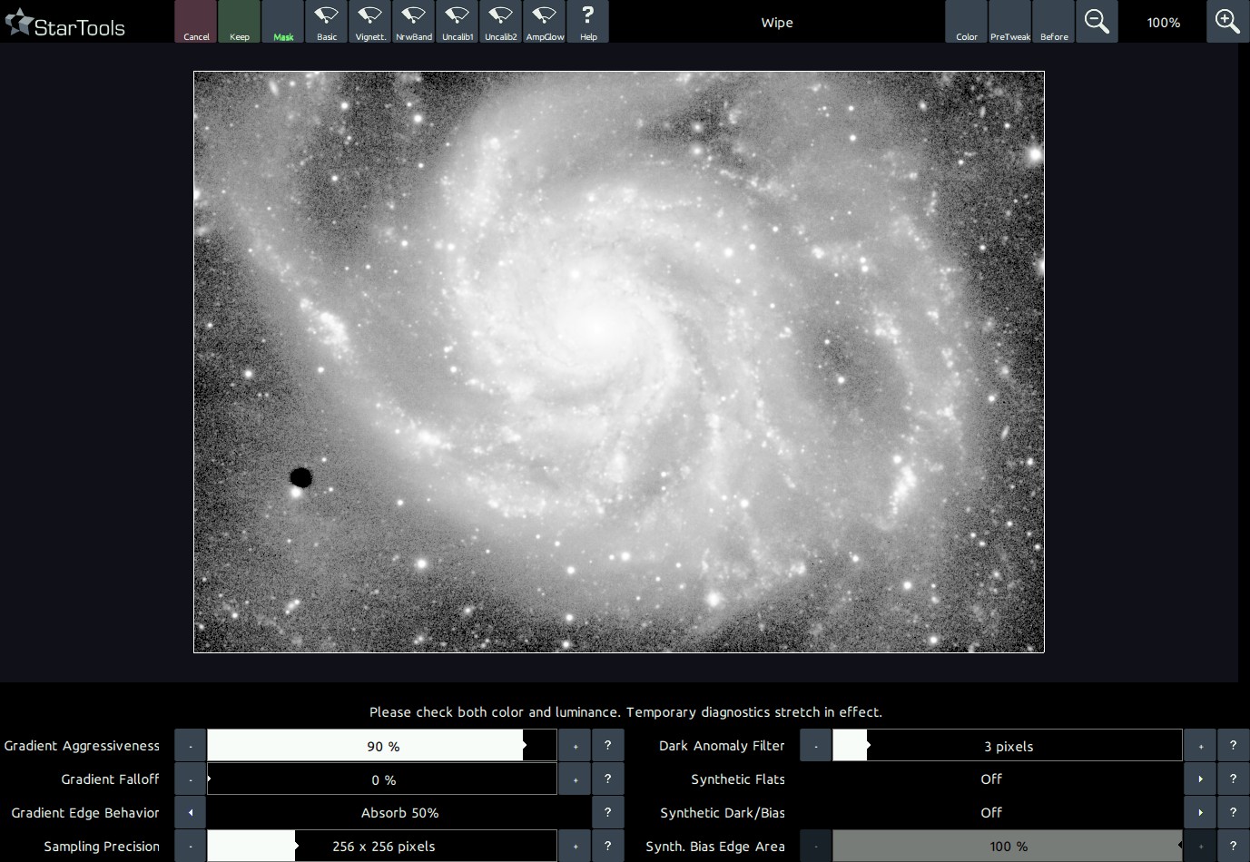Image "Simulated dust speck causing a halo."Image "Mask editor interface with dust speck masked out."Image "Dust speck no longer causing halo."Image "AutoDev interface with image of M101 being stretched."