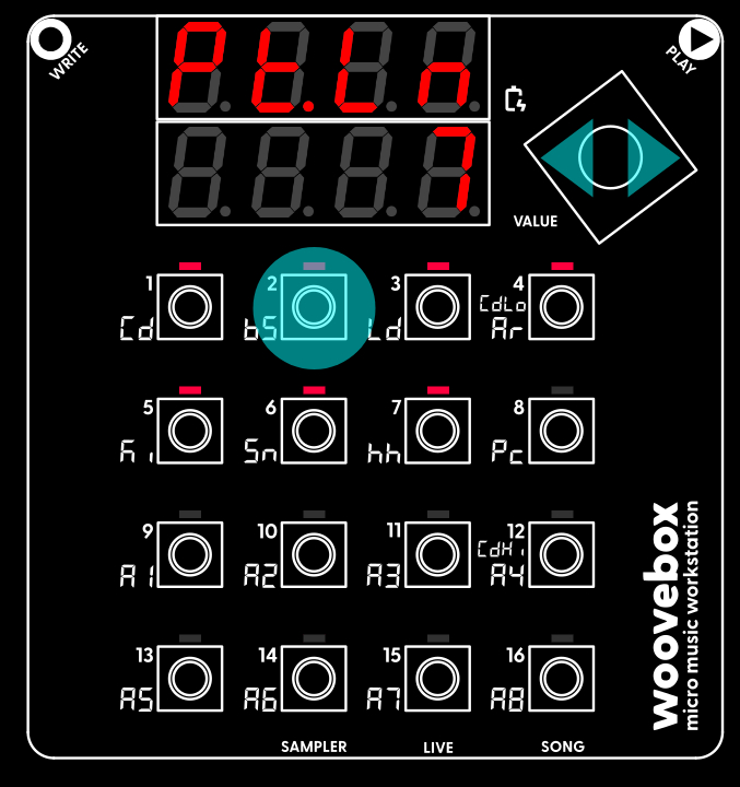 Arpeggios are short runs and are typically not as long as full patterns (e.g. they are typically not as long as, say, our bassline pattern). Use the value knob to scroll to the "Pttn" page. Change the "Pt.Ln" ("Ptrn Len" / pattern length) parameter under the 2 key. It is likely set to 16 (playing all of the 16 steps of the pattern). However, for an arpeggio, typically short runs are more suitable. Set "Pt.Ln" to, for example, 5 or 7.