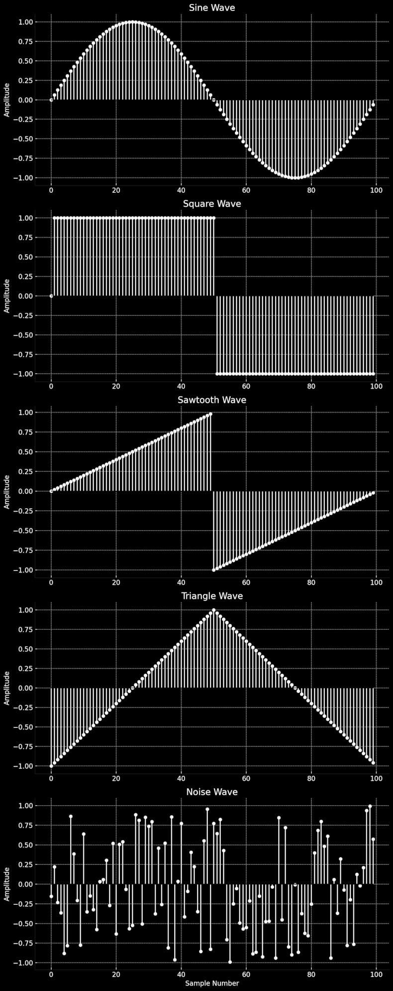 A Woovebox voice is generated by combining up to two oscillators and - in some cases - white noise. Oscillators range from basic waveforms such as sine, saw, pulse and triangle waves, to more complex waveforms such as 5ths, supersaws, user-imported samples, delay taps and even live external audio.