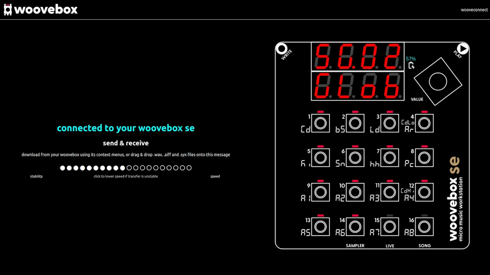 If you find bi-directional connections unstable when uploading data to your Woovebox, you can use the stability vs speed control to tradeoff throughput for stability.